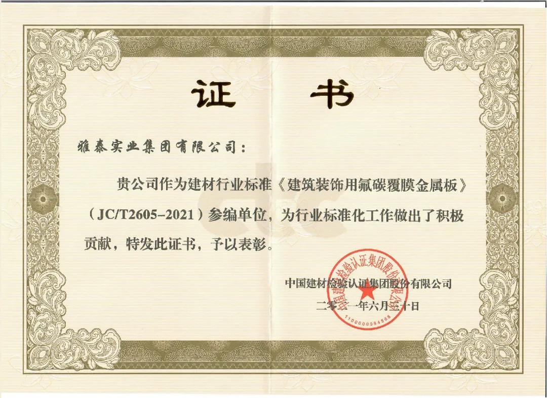 近日,由中國建筑材料聯(lián)合會提出,雅泰實業(yè)集團參與起草的《JC/T2605-2021建筑裝飾用氟碳覆膜金屬板》、《JC/T2607-2021建筑屋面用預輥涂金屬板》兩項行業(yè)標準于2021年3月5日發(fā)布,同年7月1日正式實施,公司技術(shù)部經(jīng)理林葉挺為此次兩項行業(yè)標準的主要起草人之一。