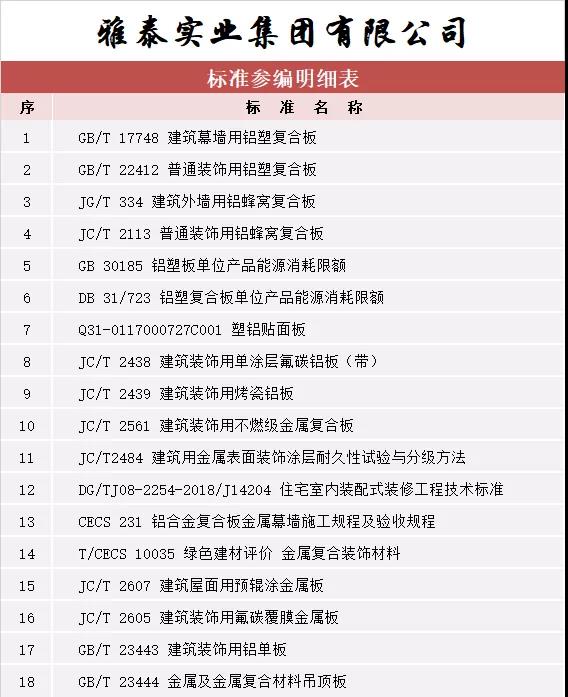 截至目前,雅泰作為參編單位參與國家標準、行業(yè)標準等各項標準共計 18 項(詳見參編標準一覽表),逐漸成為行業(yè)推進標準化工作的主力軍之一,不斷證明公司地位及整體生產(chǎn)水品、產(chǎn)品實力等已得到業(yè)內(nèi)認可。